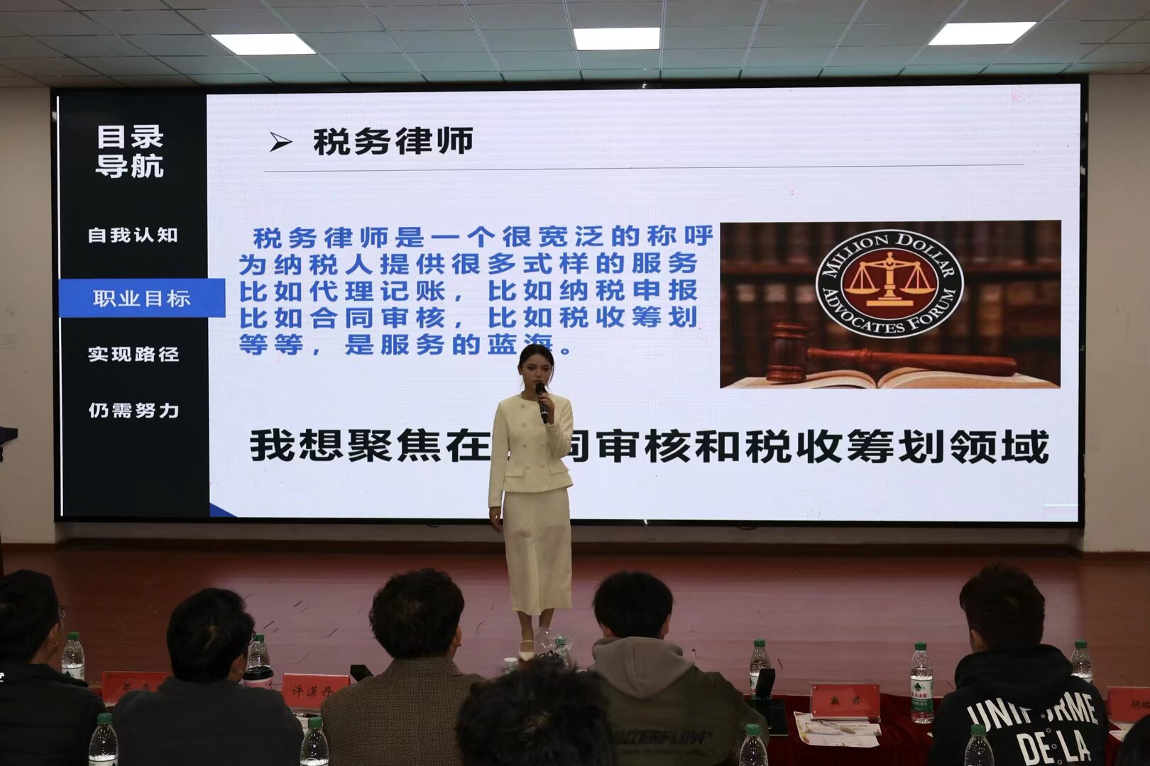 本次大赛设成长与职业两大赛道,选手尽显风采。成长赛道上,杨奇昌同学以公务员为目标,凭学业、实践定分阶段规划及备选方案;季嘉婧同学瞄准合同审核与税收筹划领域的税务律师,依自身素养、荣誉及行业趋势规划路径;温俊超同学结合综合能力、赛事经历与行业环境明确目标并制定计划;其他同学也立足优势、研判行业,以分阶段计划展现未来构想。职业赛道中,高大卫、雷添翼同学紧扣行业趋势,以 AI 为赋能核心,融合专业与职业目标,为职业发展注入创新力。