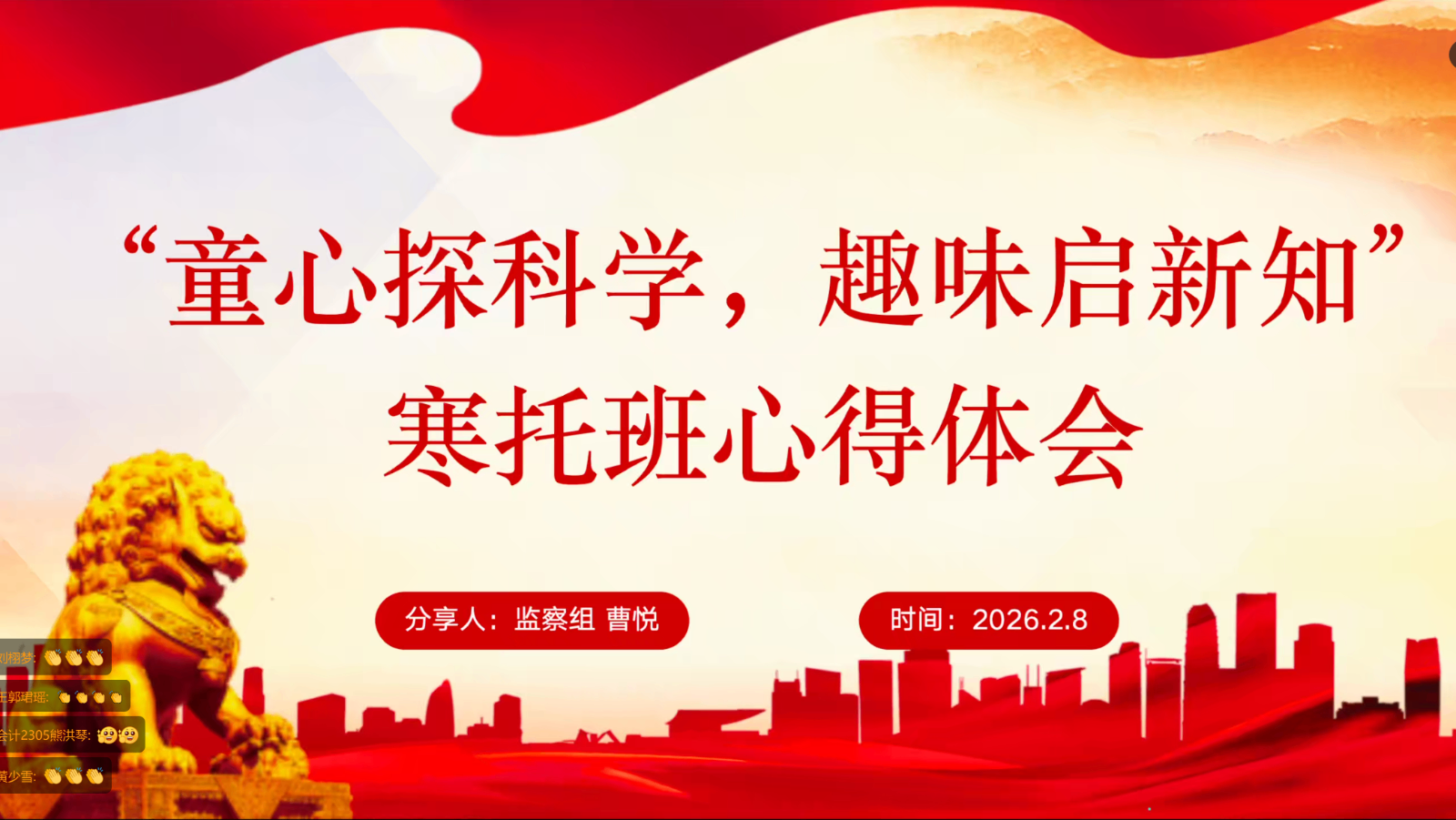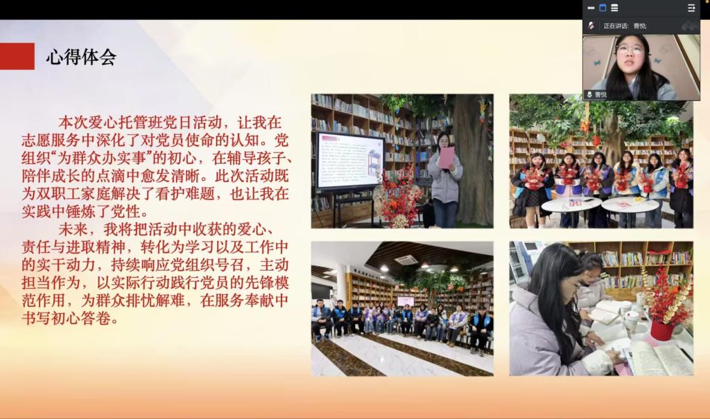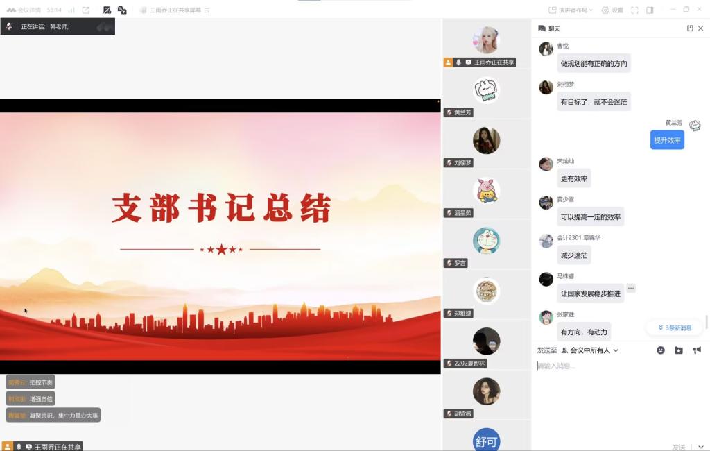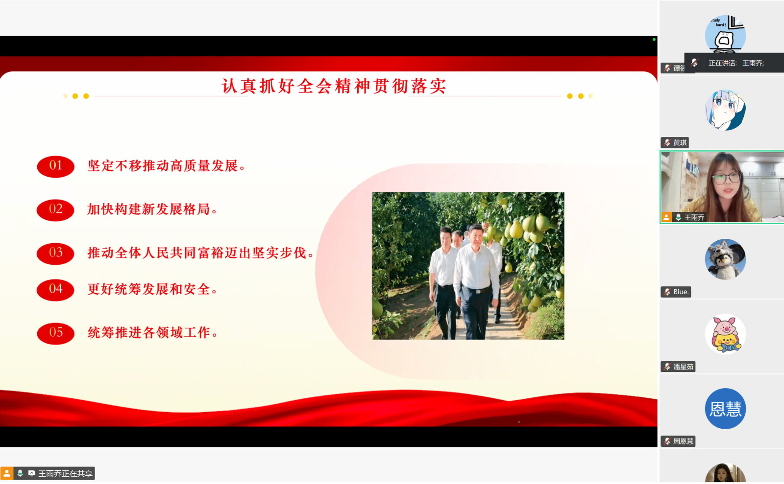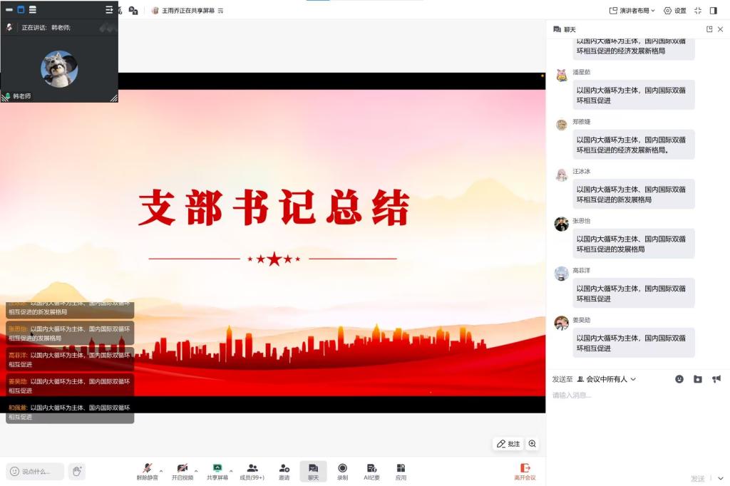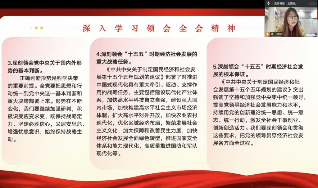 王雨乔同志带领支部成员围绕党的二十届四中全会精神、习近平总书记主持民主生活会重要讲话、2026年党风廉政建设和反腐败工作部署、中央经济工作会议精神及习近平主席2026年新年贺词五大核心内容展开系统学习。领学中,她着重阐释“十五五”时期经济社会发展的重大意义与实践要求,强调以全面从严治党为经济社会发展提供根本保证;引导大家深刻领悟“两个确立”的决定性意义,明确青年党员的理想信念与担当要求;梳理2025年纪检监察工作成效,详细讲解2026年党风廉政建设要求,筑牢拒腐防变思想防线;围绕2026年经济工作重点任务,解读扩大内需、改革攻坚等方向,帮助成员把握国家发展布局;最后带领大家学习习近平总书记新年贺词,从中汲取奋进力量,践行使命担当。