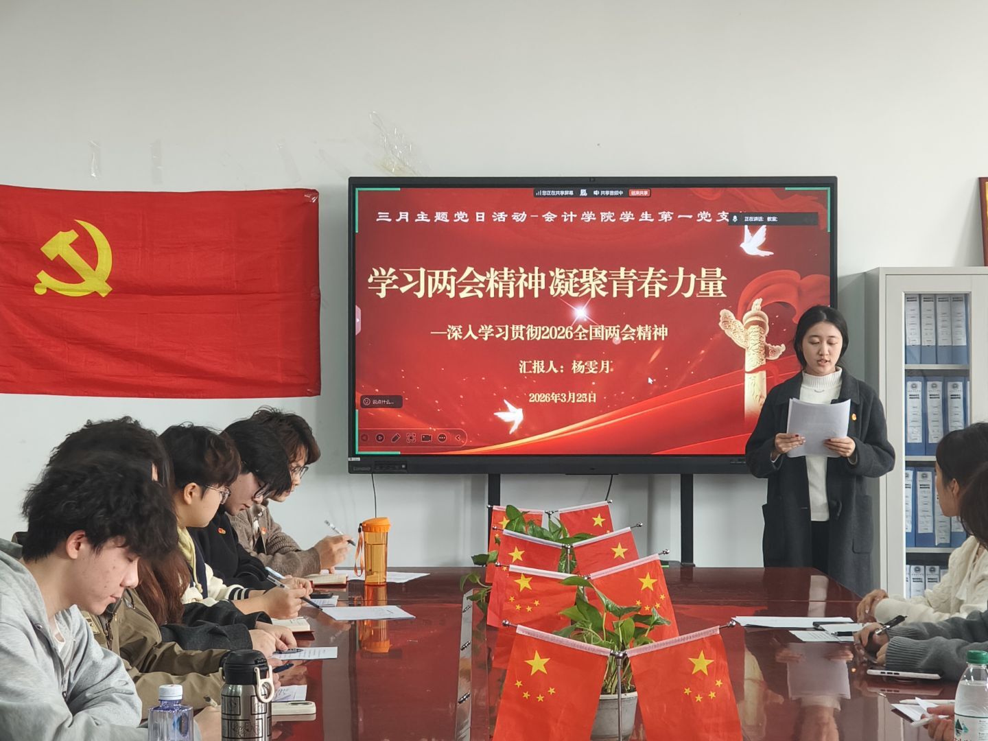 杨雯月同学树立和践行正确政绩观学习教育党的二十届四中全会精神、深入贯彻2026年全国两会精神作学习心得分享。她系统阐释了正确政绩观的核心要义,指出其立足“十五五”开局关键节点,以“立党为公、为民造福、科学决策、真抓实干”为总要求,通过“学查改”一体推进的实践路径,从思想根源上解决“为谁创造业绩、创造什么业绩、怎样创造业绩”的根本问题。在学习党的二十届四中全会精神部分,深入解读了“十五五”时期的重大意义与“六个坚持”原则,围绕推动高质量发展、加快构建新发展格局等战略任务进行了系统阐述。在贯彻两会精神部分,从“领航定向、向新而行、向智而为、向民而生”四个维度展开,重点剖析了培育新质生产力、打造智能经济新形态、增进民生福祉等战略部署。并且号召全体党员将个人理想融入国家发展大局,以过硬本领践行初心使命,在强国建设中贡献青春力量。