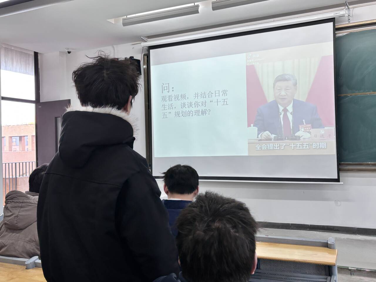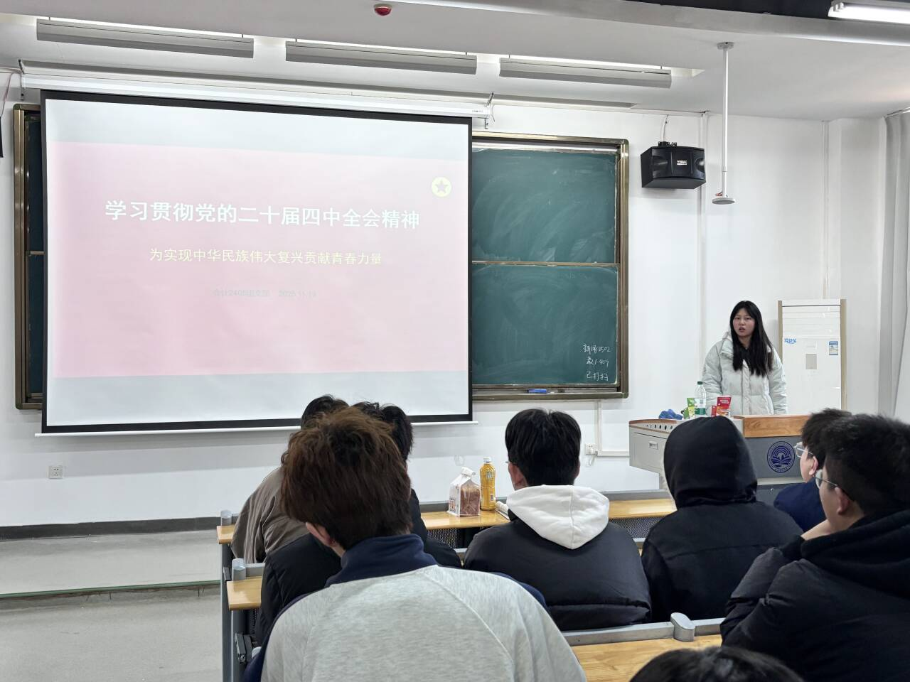 活动伊始,团支书朱滨彬率先解读全会背景:2025 年 10 月 20 日至 23 日,党的二十届四中全会在北京召开,核心议程是审议通过《中共中央关于制定国民经济和社会发展第十五个五年规划的建议》。她强调,“十五五” 时期是我国基本实现社会主义现代化的关键阶段,机遇与风险挑战并存,青年学子需主动把握时代脉搏,明晰自身责任。
